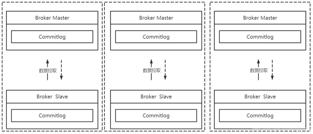 RocketMQ 默认采取的是主从同步,当然从RocketMQ4.5引入了多副本机制,但其副本的粒度为 Commitlog 文件,上图中不同 master 节点之间的数据完成不一样(数据分片),而主从节点节点数据一致。