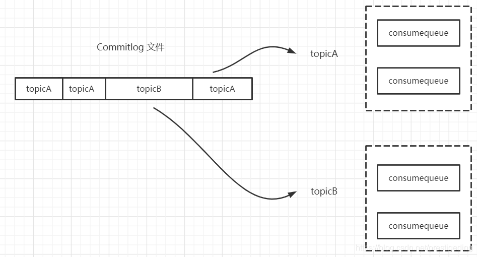 RocketMQ 所有主题的消息都会写入到 commitlog 文件中,然后基于 commitlog 文件构建消息消费队列文件(Consumequeue),消息消费队列的组织结构按照 /topic/{queue} 进行组织。从集群的视角来看如下图所示:
