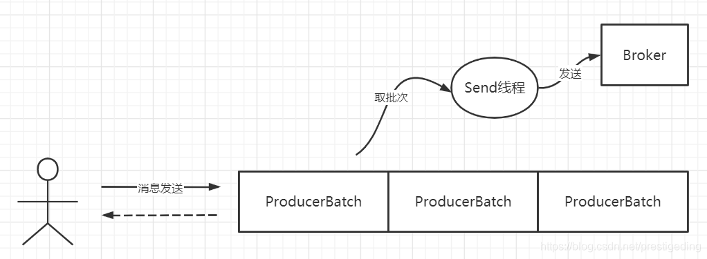 Kafka 在消息发送客户端采用了一个双端队列,引入了批处理思想。其消息发送机制如下图所示: