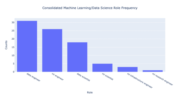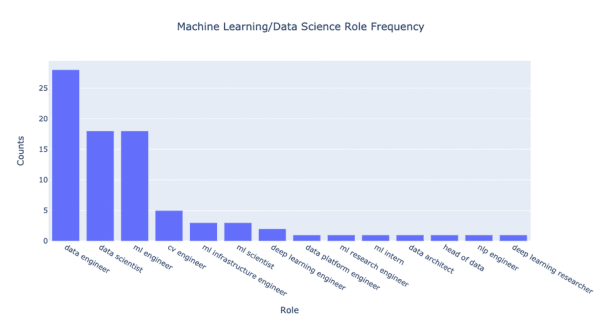 我可以将 ML research engineer(MLL 研究工程师)归到 ML scientist(ML 科学家)或 ML engineer(ML 工程师)一栏,但是鉴于这是一个混合职位,所以我将其保留了下来。