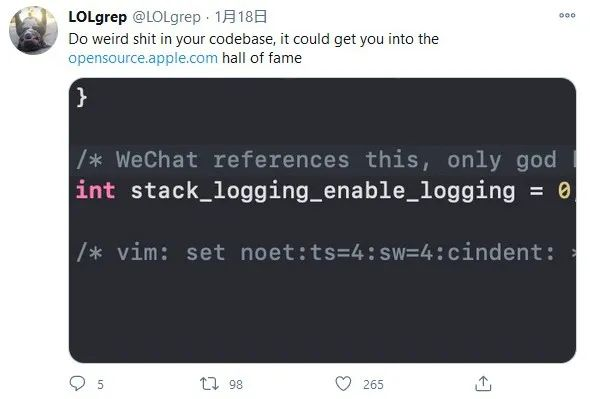 这份名为“make_tapi_happy.h”的文件早在 2018 年就已创建,苹果工程师引用 stack_logging_enable_logging 目的为了兼容,因此他或许并不了解微信代码中的这个整型变量有何作用,否则也不会从旁注释写道:“WeChat references this, only god knows why. This symbol does nothing.(天知道为什么微信会引用它,这个变量没有任何用处。)”
