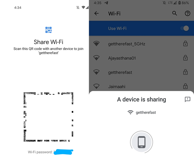 早在 Android 10 和 Android 11 中,用户就可以使用指纹验证看到 WiFi 密码,并通过二维码分享。在 Android 12 的网络设置中,点击“共享”按钮,则会看到“附近共享”的专用按钮,点击该按钮后,用户就可以与附近的其他 Android 用户快速共享网络 SSID 和密码。