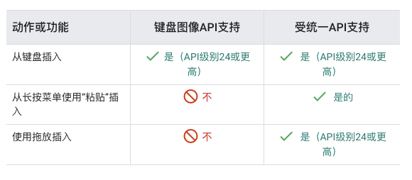 与传统键盘图像 API 的比较,统一的 API 提供了一个单一的位置来处理传入的内容,而与特定的 UI 机制无关,例如从长按菜单粘贴或使用拖放操作。