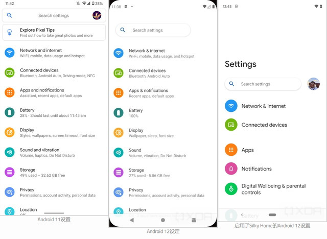 随着手机屏幕尺寸越来越大,单手进行所有操作基本已经不可能,在 Android 12 上,添加了一个名为“Silky Home”的功能图标,该功能可以将页面上的内容进一步下拉,使其更容易被点按。