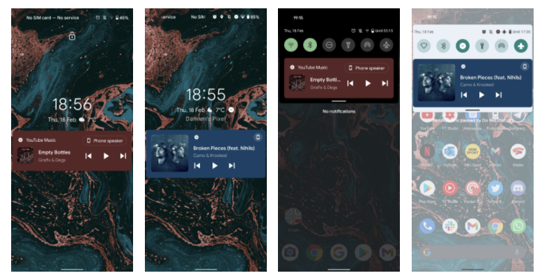锁屏与下拉通知栏的播放控制(左:Android 11;右:Android 12 DP1)