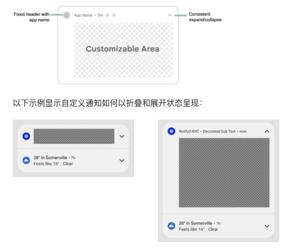 Android 12 则更改了自定义通知栏的外观,不再使用完整的通知区域,而是采用系统的标准模板,确保自定义通知在所有状态下都与其他通知具有相同的外观,例如通知图标和扩展功能(处于折叠状态)以及通知的图标,应用程序名称和折叠功能(处于扩展状态)。