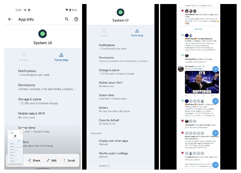 但目前的测试看,只能在少数情况下激活滚动截屏,在设置和 Twitter 中,滚动截屏可以正常使用,捕获整个滚动屏幕中的内容,但在 Chrome 或 Google Discover 上,还无法使用滚动截屏。