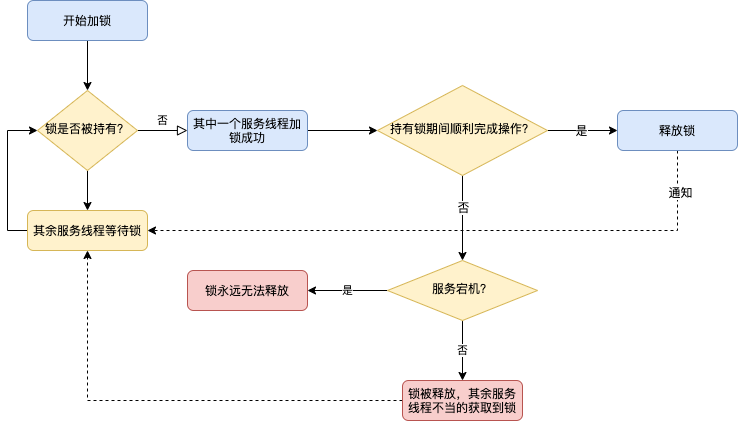 前面讨论了分布式锁怎么保证共享资源的安全,但是由于分布式锁宿主在譬如 redis、zookeeper 等中间件中,加锁、释放、锁续期等也是在进程与 redis 之间通信,那么就引出了一些单点加锁不存在的问题:那就是服务如果宕机了怎么办?或者加锁是有时间的,如果时间过了持有锁的任务还没有完成怎么办?这时候看起来就像下图可能出现的情况