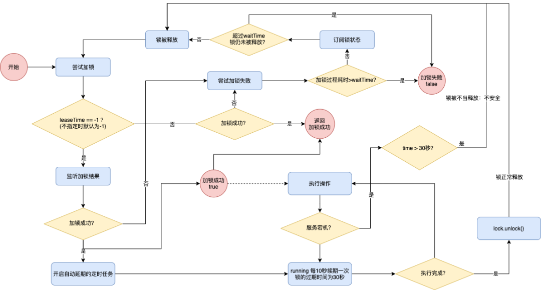 而当我们指定 leaseTime 时,我们可以看出来前面的代码不会走到定时续期锁的逻辑,这时表示:成功获取到锁后,在 leaseTime 后,如果锁仍没有被服务主动释放,锁将自动过期,而不会管持有锁的线程有没有完成对应的操作,相当于在持有所得服务执行了比较耗时的任务且未完成时,这时锁已经被释放,这时候自然也是不安全的。上面两段代码的流程如下: