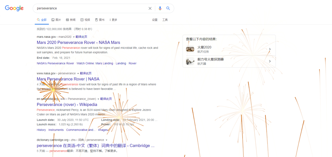 据外媒报道, Google 搜索团队显然不能让“毅力号”最终登陆火星这一历史性时刻就这么过去。 据悉,Google 现在在其搜索主页加入了跟“毅力号”相关的彩蛋(比如在搜索框输入“perseverance”即可出现烟花)。而用户需要做的就是在 Google 搜索中执行一些跟“毅力号”漫游者相关的搜索。