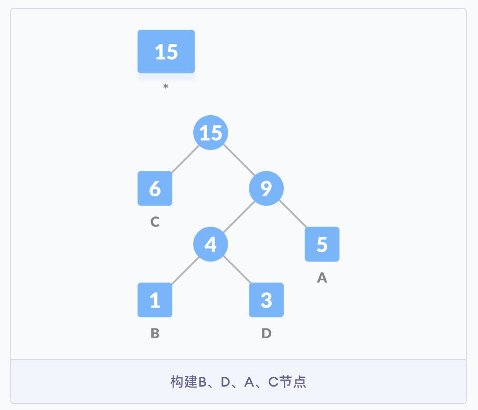 继续按照之前的思路构建树,直到所有的字符都出现在树的节点中。