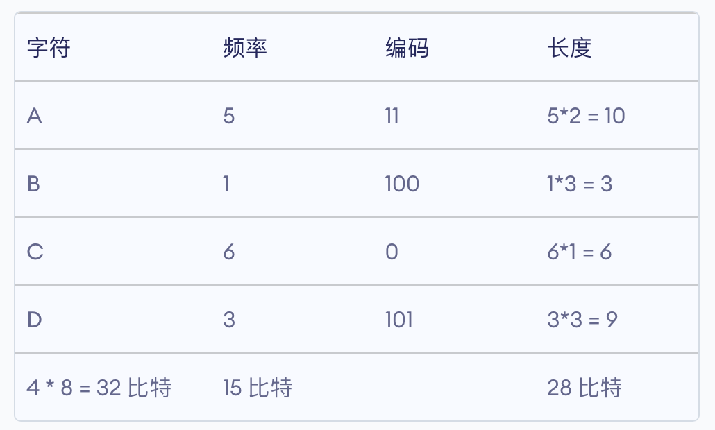 如果我们使用霍夫曼编码的话,就可以将这串字符压缩到一个更小的尺寸。怎么做到的呢?
