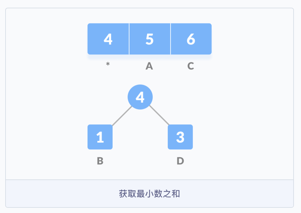 B 的频率最小,所以在左侧,然后是频率为 3 的 D,在右侧;然后把它们的父节点的值设为 4,子节点的频率之和。