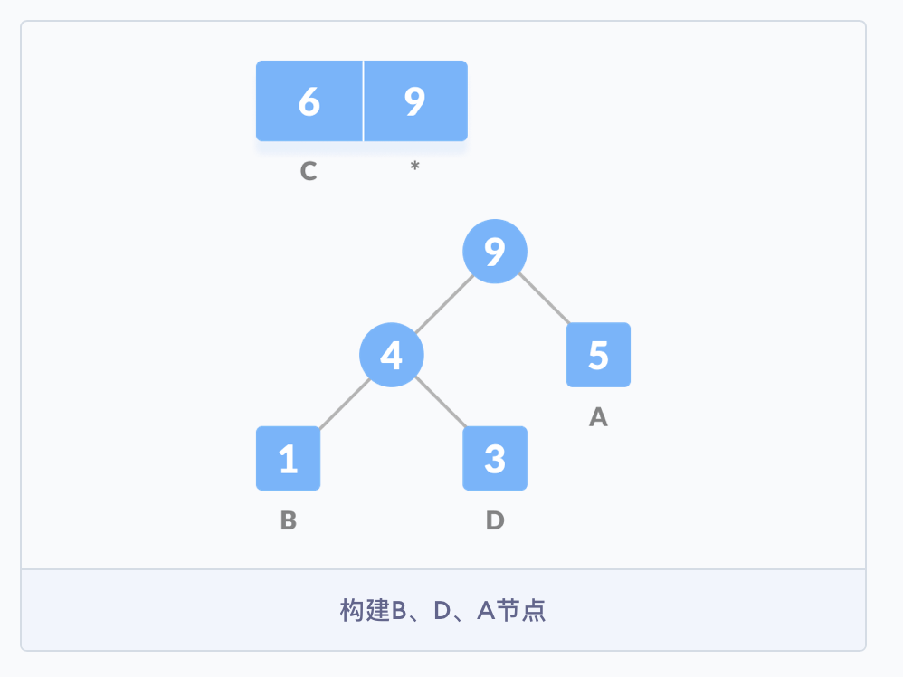 然后从队列 Q 中删除 B 和 D,并将它们的和添加到队列中,上图中 * 表示的位置。紧接着,重新创建一个空的节点 z,并将 4 作为左侧的节点,频率为 5 的 A 作为右侧的节点,4 与 5 的和作为父节点。