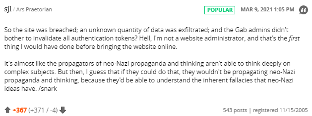 评论 1:所以网站被破坏了;数量未知的数据被窃取;Gab 管理员没有让所有身份验证 Token 失效吗?见鬼,如果我是网站管理员的话,这是我在把网站上线之前要做的第一件事。