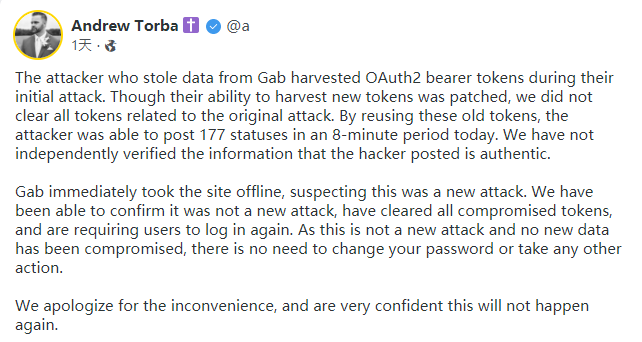 Torba 表示,由于上次黑客还窃取了用户用于身份验证的 Token,而 Gab 工作人员并没有及时将这些被窃取的 Token 完全清除,因此这次黑客就利用了这些还没被处理的 Token 在 8 分钟内发布了 177 个帖子。
