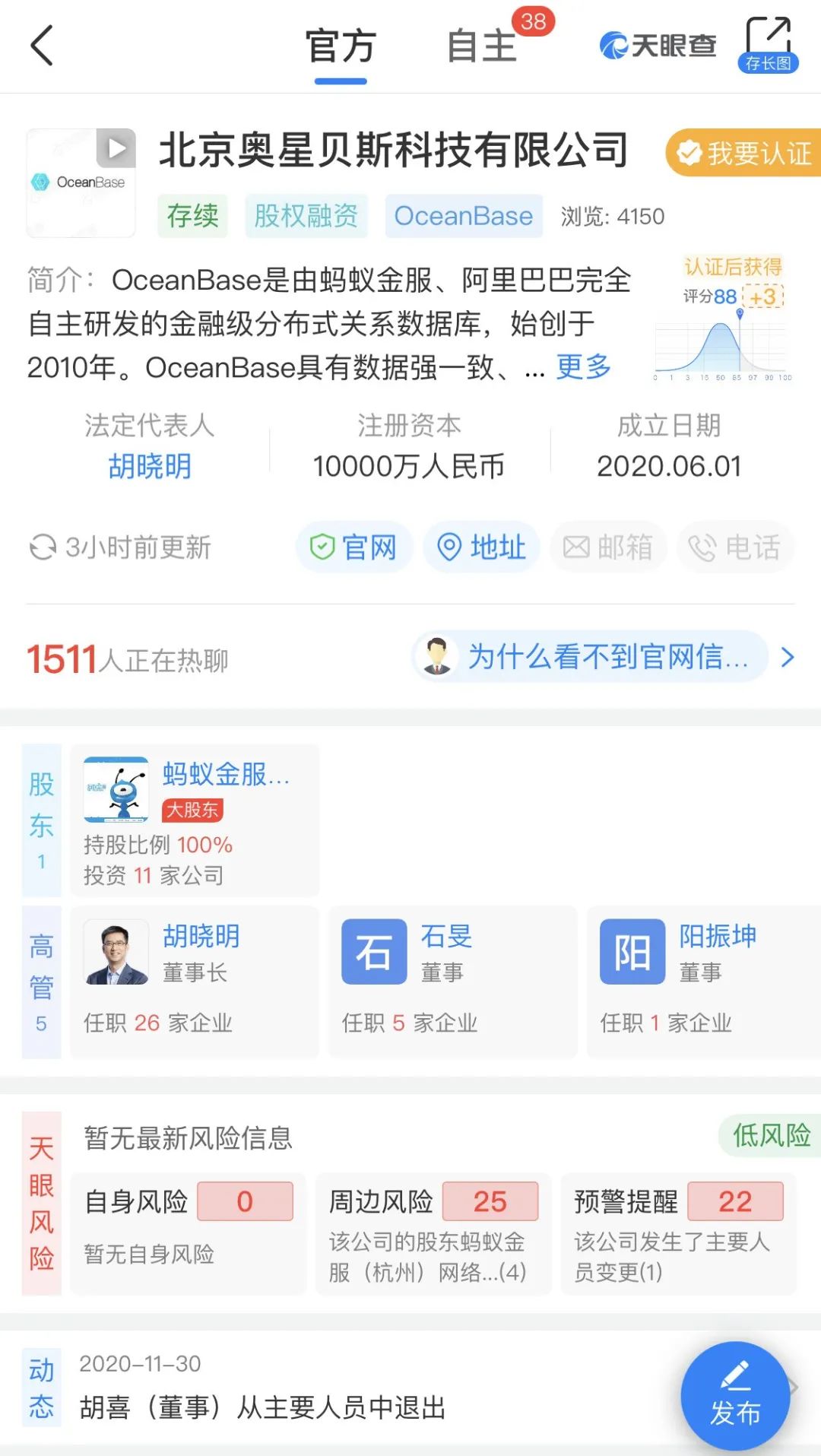 2020 年,蚂蚁集团宣布将自研数据库产品 OceanBase 独立,成立商业数据库公司北京奥星贝斯科技有限公司,由蚂蚁集团 100% 持股,集团 CEO 胡晓明担任新公司董事长。