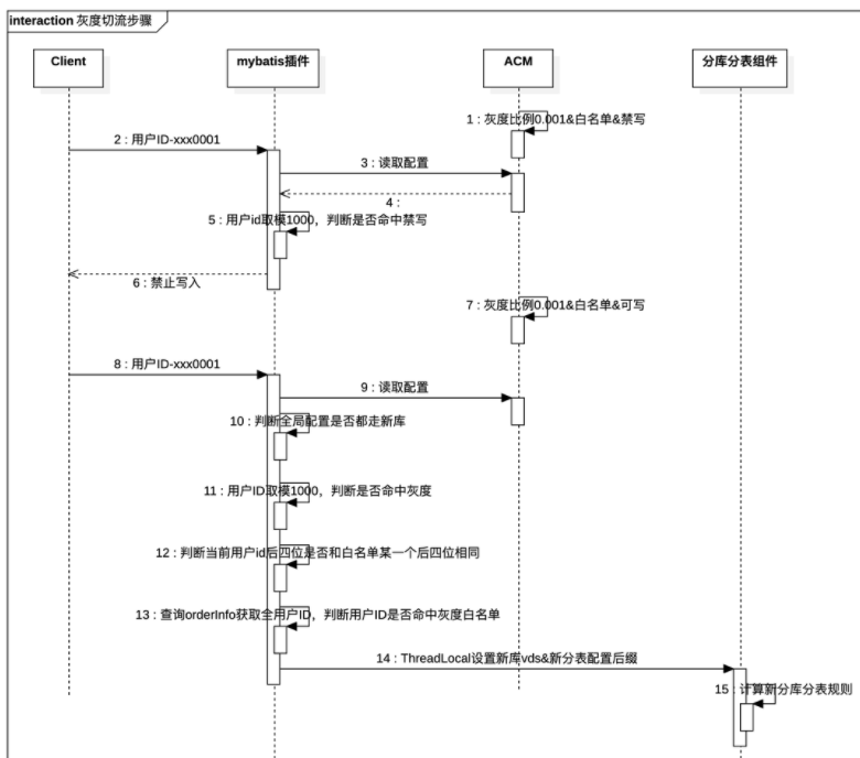代码拦截mybatis请求,根据用户id后四位取模,和ACM设置中设置的灰度比例比较,将新库标识通过ThreadLocal传递到分库分表组件。