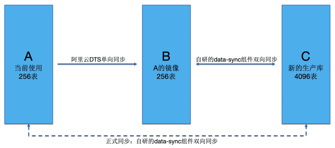 配置DTS从A单项同步到B(dts支持同构不需要rehash的数据同步),B做为旧库的验证库,C库做为新库