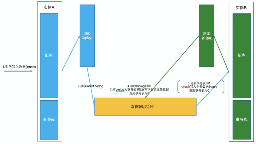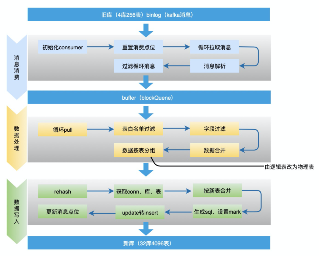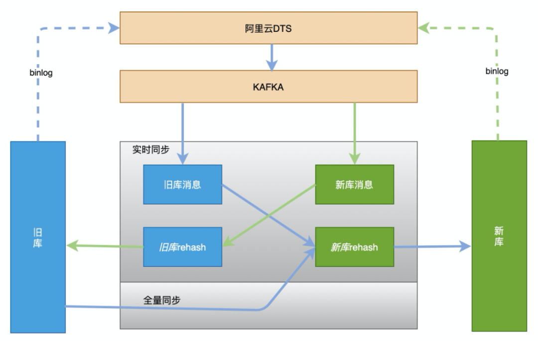 单独一个服务,使用游标的方式从旧库分批select数据,经过rehash后批量插入(batch insert)到新库,此处需要配置jdbc连接串参数rewriteBatchedStatements=true才能使批处理操作生效。