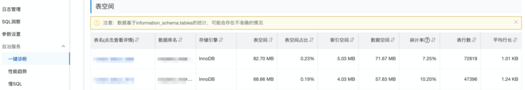 通过RDS后台一键诊断功能,来计算表空间使用情况(这里拿测试环境数据库举例)。