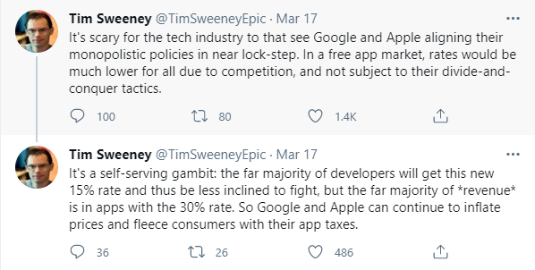 对此,Epic Games CEO Tim Sweeney 在推特发表批判谷歌和苹果“自私自利”。