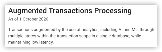 在此场景下Oracle无法满足扩展能力,而Hadoop又无法支持实时并发业务。国际上也没有直接与其对标的技术体系,最为贴近的则是Lakehouse(湖仓一体化)。Lakehouse的行业主要厂商包括像Snowflake及Databricks等分布式数据库厂商,其产品可以分为数据湖与计算引擎两大核心模块。2020年Gartner进一步引入了Augmented Transactions Processing处理场景,强调事务一致性,要求数据库在分析处理过程中同时保持低延迟,以提升实时联机处理能力。