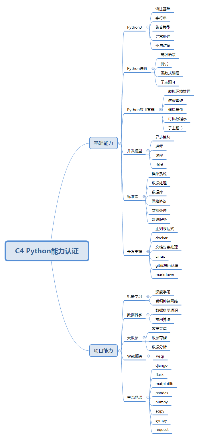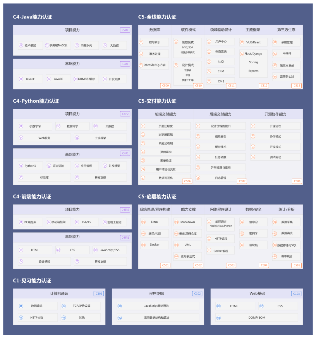 下图是C站(优快云)软件工程师能力认证标准中的C1/C4-能力认证图,分为基础能力和项目能力两大模块,可以看到模块中的技能点能够全覆盖一线大厂开发工程师的招聘JD要求。