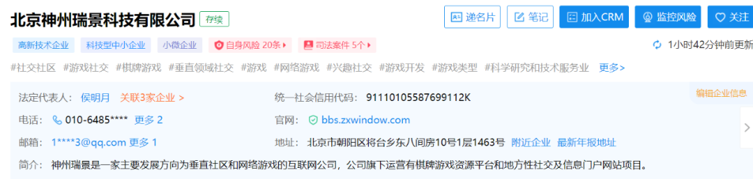 原告是神州瑞景,该公司在企查查上的简介是:“一家主要发展方向为垂直社区和网络游戏的互联网公司,公司旗下运营有棋牌游戏资源平台和地方性社交及信息门户网站项目。”