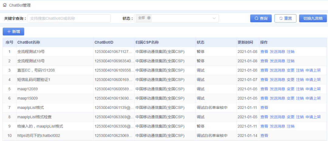 5G行业消息运营平台提供Chatbot管理,支持新增、变更、删除等操作,开发者无需自研AI能力便可使用: