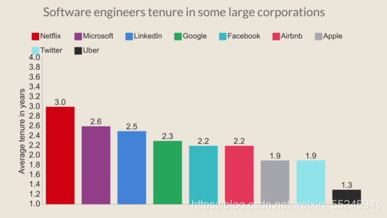 下面这个图表显示,小公司的软件工程师平均任期只有1.5年,而大公司则是2.3年。