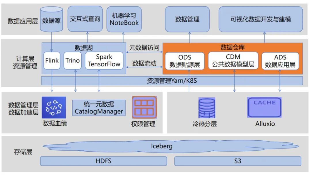 其中,数据存储层支持 OSS、S3、Minio 等对象存储和 Hadoop HDFS。对象存储存储非结构化、原始数据、冷数据,提供高性价比,HDFS 存储结构化数据,提供高性能存储。使用 Iceberg、Hudi、Delta 作为数据存储中间层,能够基于 HDFS、对象存储等底层存储,支持 ACID 语义、实现快速更新能力;通过 Alluxio 进行数据缓存,加速 Spark、Flink、Trino(原 Presto)等计算引擎对数据湖的读写。