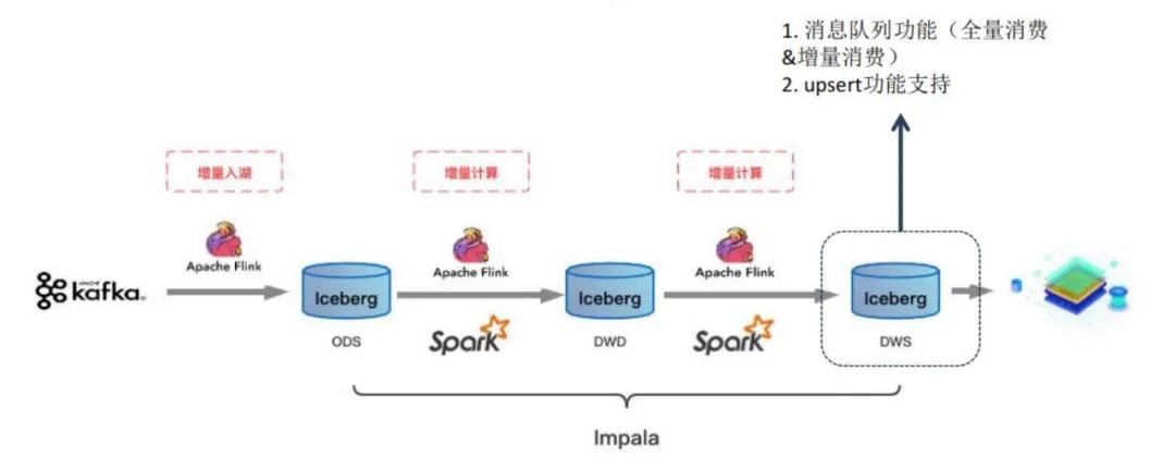 针对这些问题,FastData采用了增加计算的设计,数据源在 Kafka 中,采用增量入湖,通过 Flink 把数据写到 Iceberg 里(Iceberg 支持行级别数据删除和更新)。从 ODS 到 DWS 层,还可以采用 Impala 4.1 及以上版本,读写 Iceberg 数据,类似于消息队列,满足全量和增量的消费,并支持行级别数据的删除和更新。