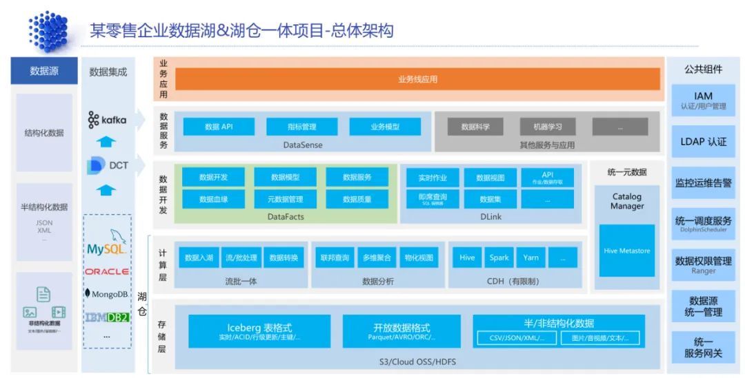 通过架构设计与研发工作,滴普科技为多家客户提供了湖仓一体的技术与服务。公开课中,刘波分享了某零售企业如何利用 FastData构建湖仓一体的完整案例。