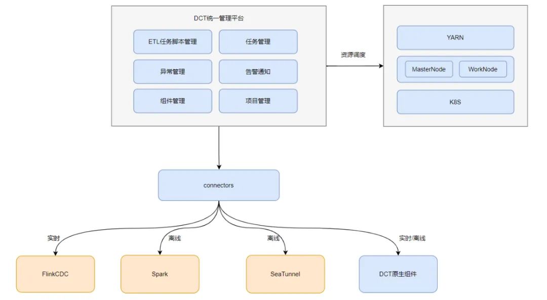 在数据入湖中,DataFacts数据集成模块,包含 ETL 任务脚本、任务管理、告警、项目管理、组件管理,组件管理可以通过自定义灵活使用,资源调度管理目前支持 Yarn、K8S,还可以本地化的资源调度管理方式,通过 MasterNode、WorkNode 去实现资源调度管理。在平台完成配置后,通过 Connectors 组件,例如通过 Flink CDC 抓取日志,实时采集数据,采用Spark 或复用 SeeTunnel 的Connector 离线采集数据,还可以集成自研的组件,支持实时和离线的数据采集。