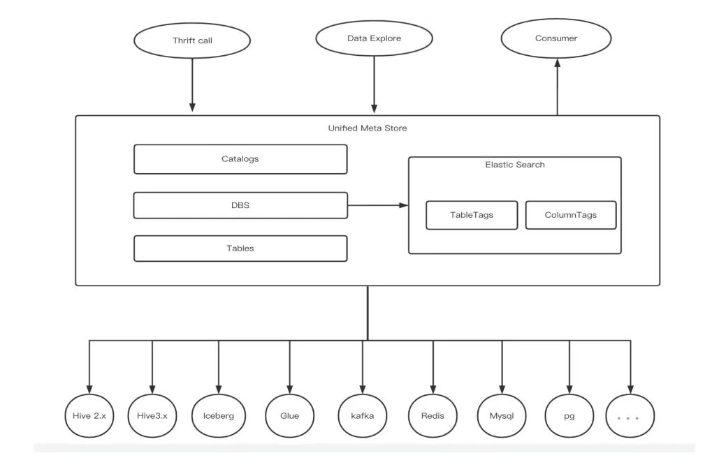 客户端通过 rpc 调用统一元数据服务,提供租户信息,元数据服务根据请求可以返回:租户拥有的 Catalogs;指定 Catalog 下的相关 databases;指定 Catalog 和 database 下的相关 tables;指定标签的数据(表、字段等)。如果自定义表结构中不存在相关信息,比如 HMS 表的分区等信息,则需要查询对应底层支持的元数据(如 HMS)。