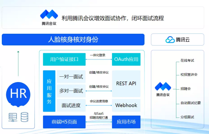 针对以上需求,腾讯云利用包括腾讯会议、人脸识别、文字识别等原子化的能力,帮助某 HR SaaS招聘产品闭环了“无接触招聘”流程。