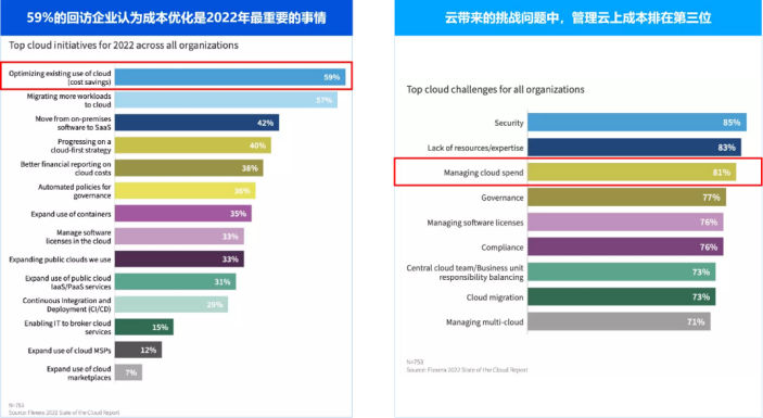 然而根据 Flexera 发布的《State of the Cloud Report 2022》数据显示,近 60% 的回访企业认为成本优化是 2022 年最重要的事情,在云带来的众多挑战问题中,管理云上成本排在第三位。可见,提升资源利用率,实现降本增效,已成为当前企业关注的重点。
