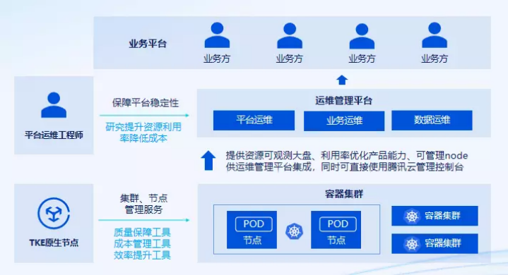 通过建设质量保障、成本管理、效率提升等工具能够解决以上问题,但多种工具的部署仍费时费力。如上图所示,腾讯云将这些功能融合进 TKE 原生节点,让平台运维工程师能够直接使用这些开箱即用的功能,保障平台的稳定性,无需做额外开发。
