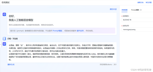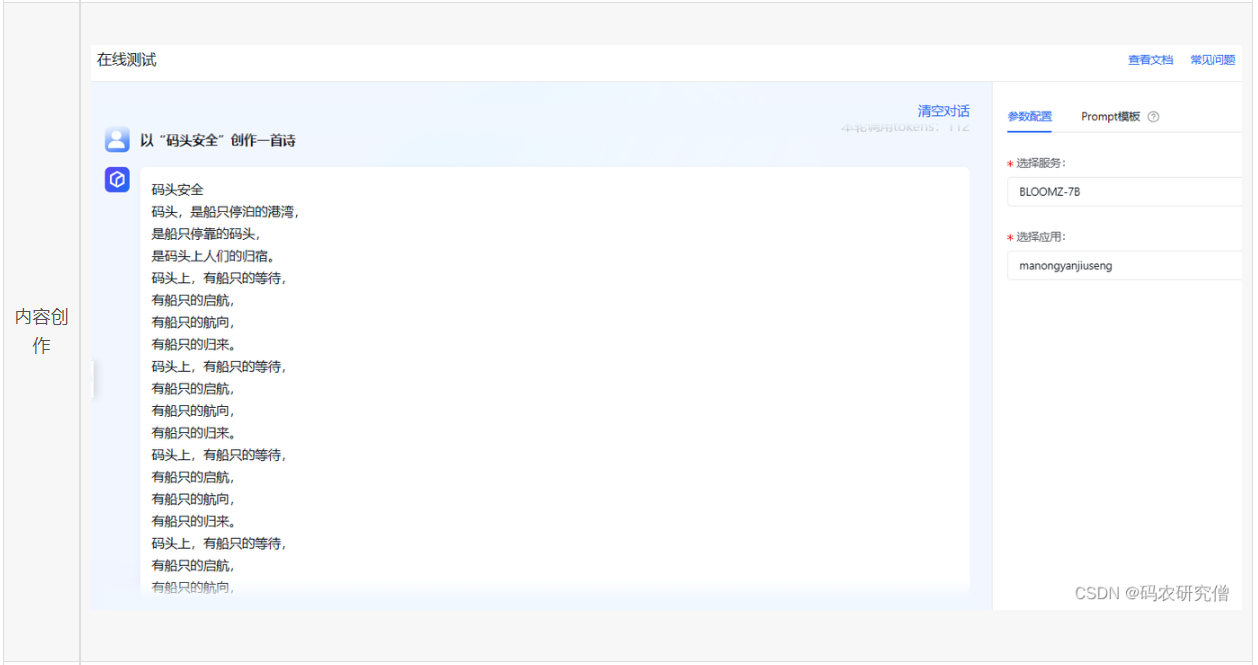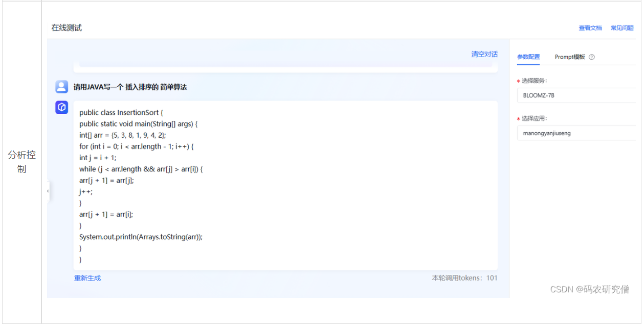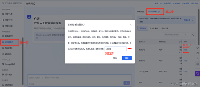 之后通过左侧栏目的在线测试调用Prompt模板,检验其是否可靠正确。