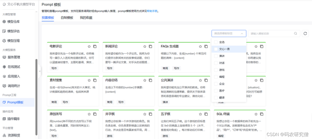 - Prompt:模板包含多种任务和应用场景,对于开发者来说可以获得有价值的资源(文心千帆的一大亮点!)。