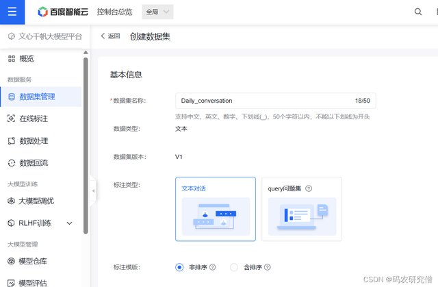 通过如下界面创建自身的数据集,针对每种数据集,可视化平台都加上注释,方便更多零门槛的人员步入这个平台。该数据集有两种标注类型,分别为文本对话以及query问题集。