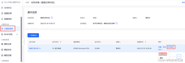 使用SFT进行训练,训练结束之后可看到模型的评估报告以及训练日志。