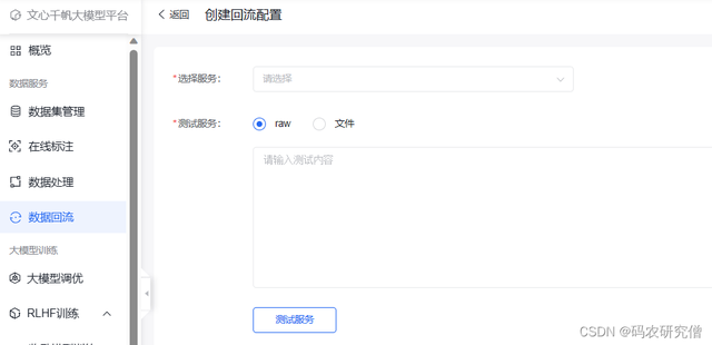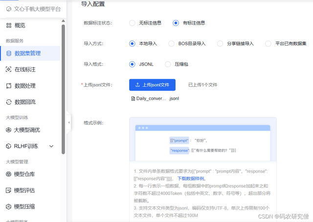 百度文心大平台的完整流程包括数据导入、数据标注、训练配置、模型纳管、服务发布以及在线测试。可视化的界面以及组件很好的诠释零门槛入门AI,从零开始构建数据集、模型训练以及部署。