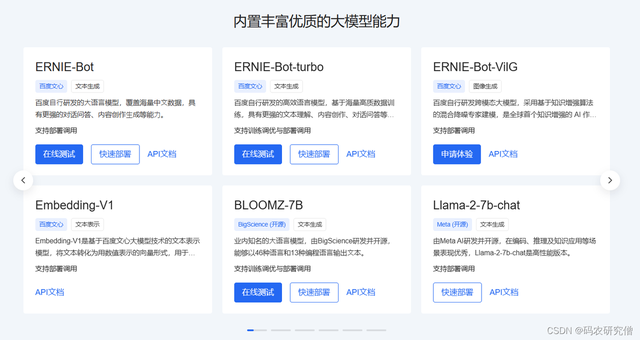 文心千帆提供了一定的大模型种类,涵盖了多种功能和应用场景,针对不同的需求,可以选择相应的API接口来满足任务的要求。每种接口在可视化的平台都有相应的注释说明,极大降低开发者门槛。