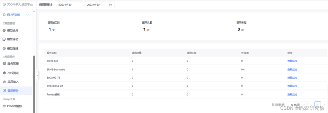 平台的扩展性极强,不仅支持定制模型接口,而且接口调用成功之后,其代码终端会有显示调用结果,其可视化界面有每个接口被调用的次数。这让更多开发者只需专注自身的开发功能,而不用在意大模型平台的功能。
