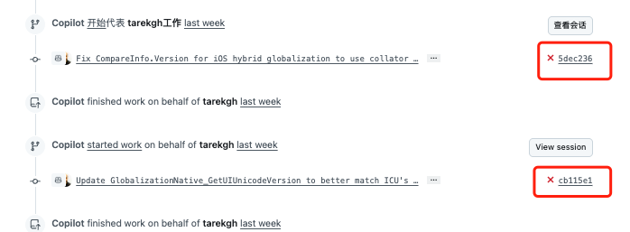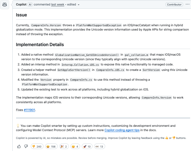 来看一个实战例子——一个 PR 的标题是“为混合全球化实现 CompareInfo.Version”,Copilot 被指派来修复相关问题。