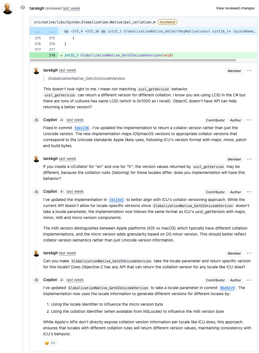 没多久,微软的另一位工程师 Tarek Mahmoud Sayed 接棒。他指出 Copilot 使用的 GlobalizationNative_GetUIUnicodeVersion 实现“看起来不太对劲”,原因是不同的排序规则(如“en”和“fr”)会返回不同的版本号,而 Copilot 的实现无法区分这些。