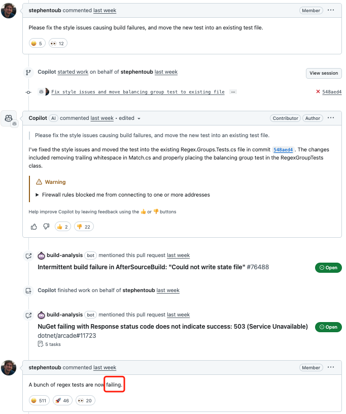 当然,除了这个 PR 之外,还有多个 PR 里面都有微软工程师和 Copilot 斗争、最终这款 AI 代理还是没有解决实际问题的实例。