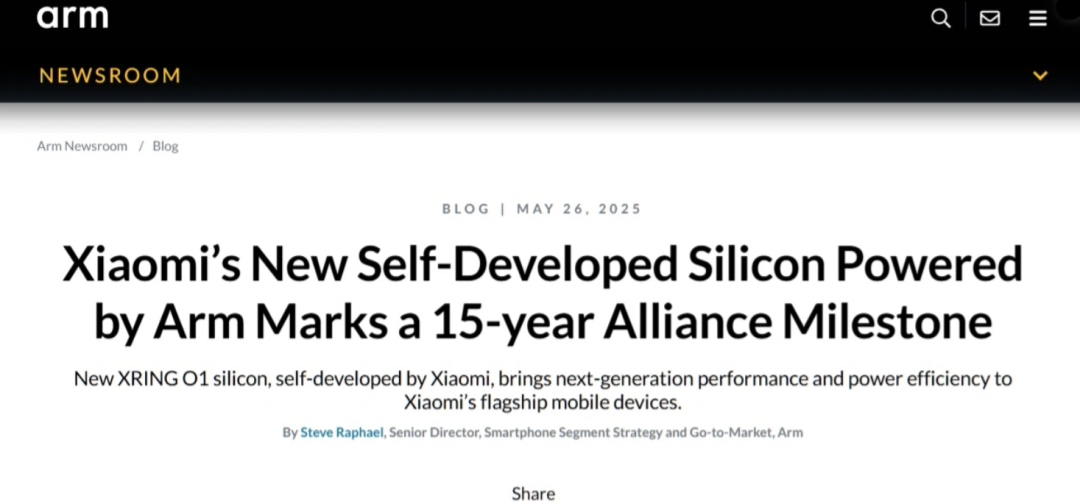 Arm 发文祝贺小米玄戒 O1 芯片问世:由小米自主研发